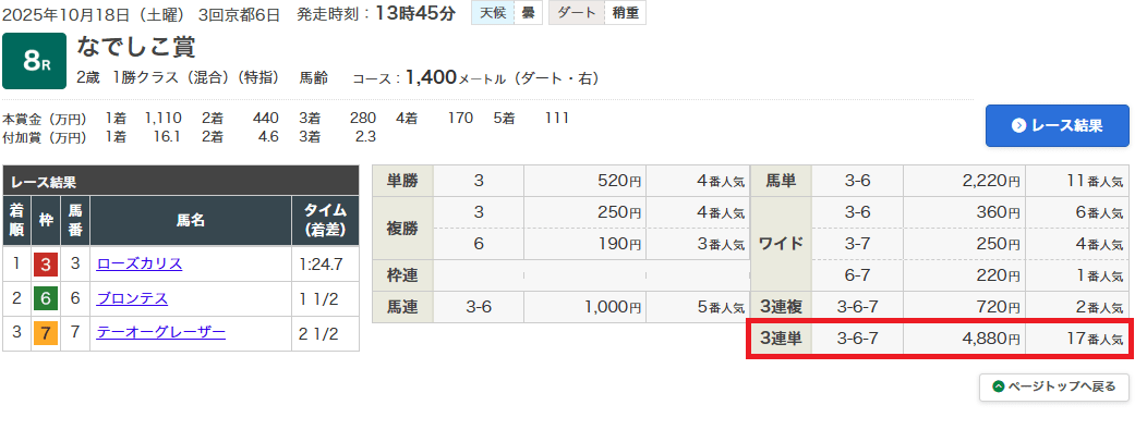 G1秋華賞前日となった前日土曜日の京都8R3連単無料予想がドンピシャ的中!