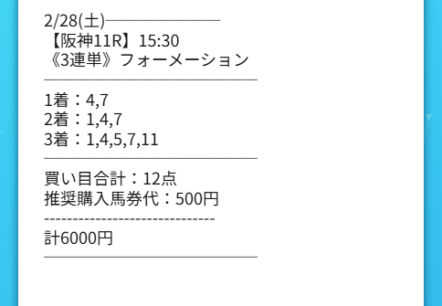 的中ありがとうございます。 3連単のフォーメーションの組み方や配当の振り分けなどかなり参考になりました。 自分は夜型人間なので、予想が今回くらいの公開時間だと助かります。