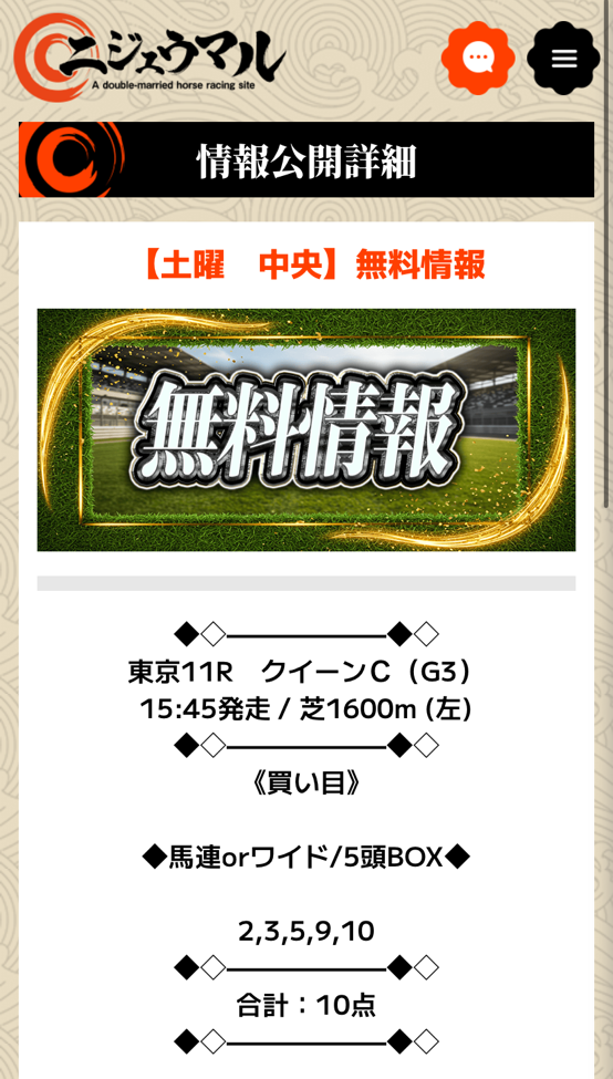 ニジュウマルの無料予想&有料予想ダブルで的中貰えました!